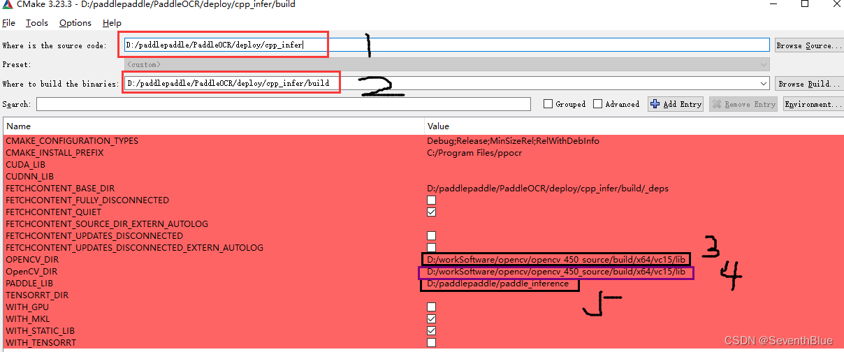 首先,打开cmake-gui填写上图中的1、2步骤,按cmake-gui中的configure按钮,出错。然后填写上图3、4、5步骤,注意填写自己安装的目录。然后再按configure。这一步,我出错了,错误如下(如果没有出错,直接按generate,项目应该能构建好,去所在的build目录打开vs项目进行下一步):