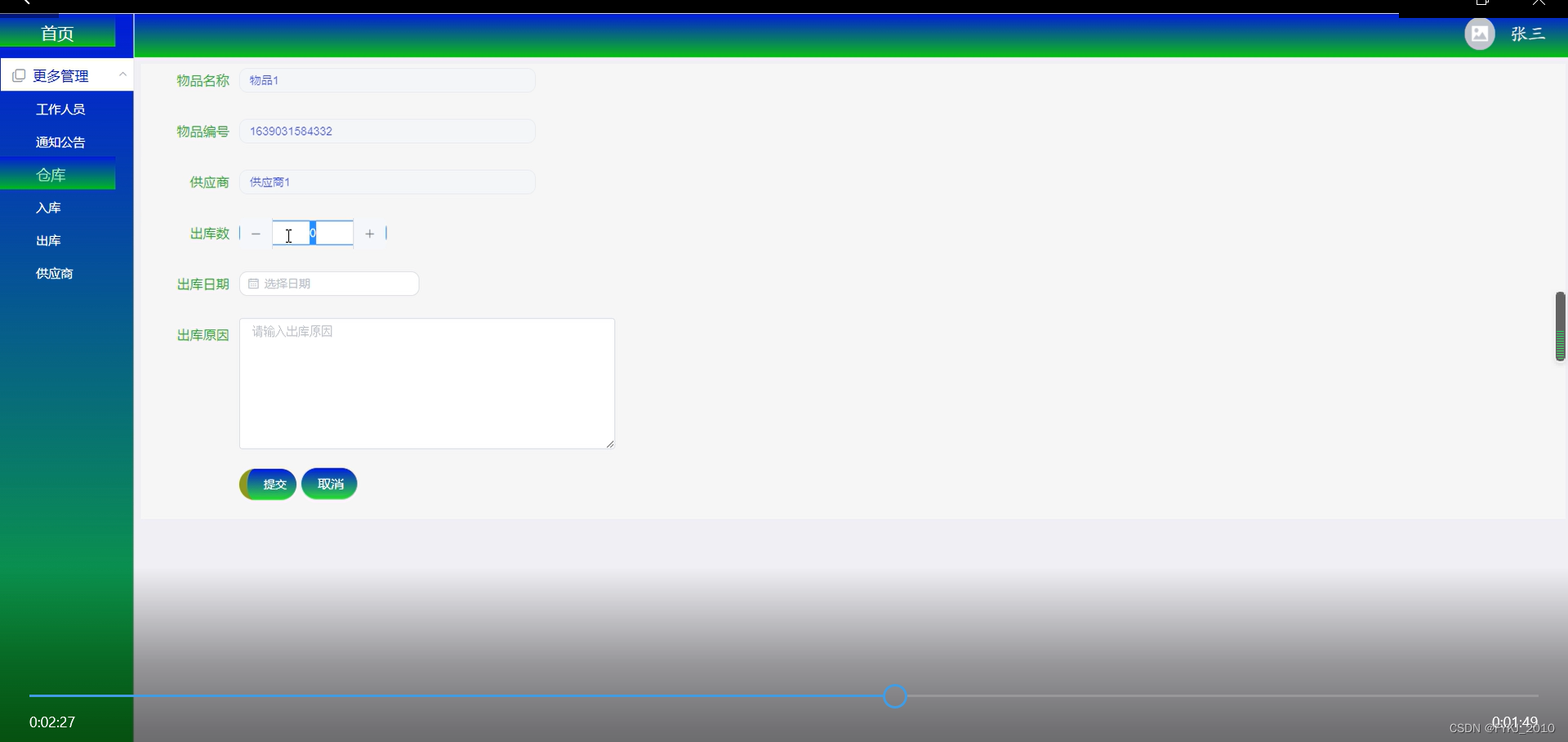 工作人员出库,填写物品名称、物品编号、供应商、出库数、出库日期、出库原因提交信息操作。物品出库提交界面如图所示。