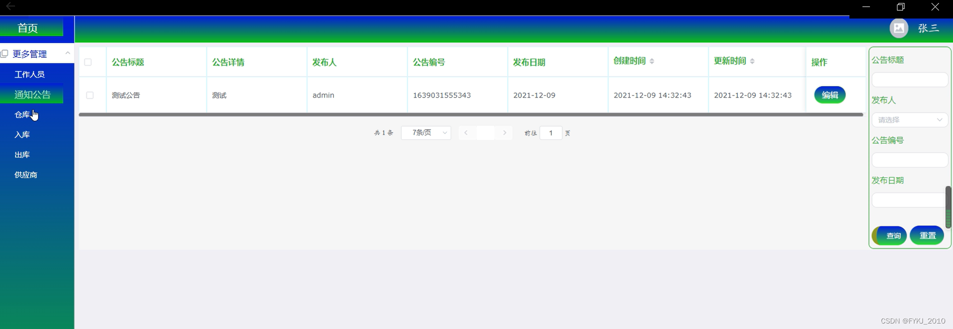 发布通知公告,并可以销毁某个通知公告,更新通知公告数据,搜索通知公告数据等。