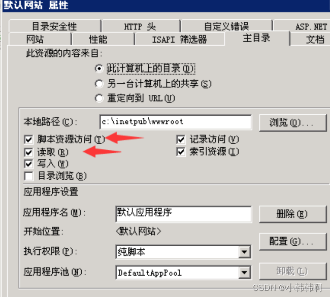 网站属性也要设置写入权限和脚本资源访问权限 步骤 默认网站–>属性–>主目录