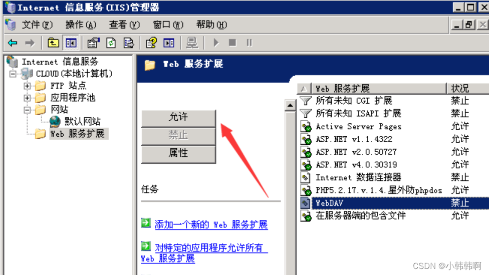 首先开启webdav 在iis服务器 web服务扩展里面 找到webdav扩展点击允许