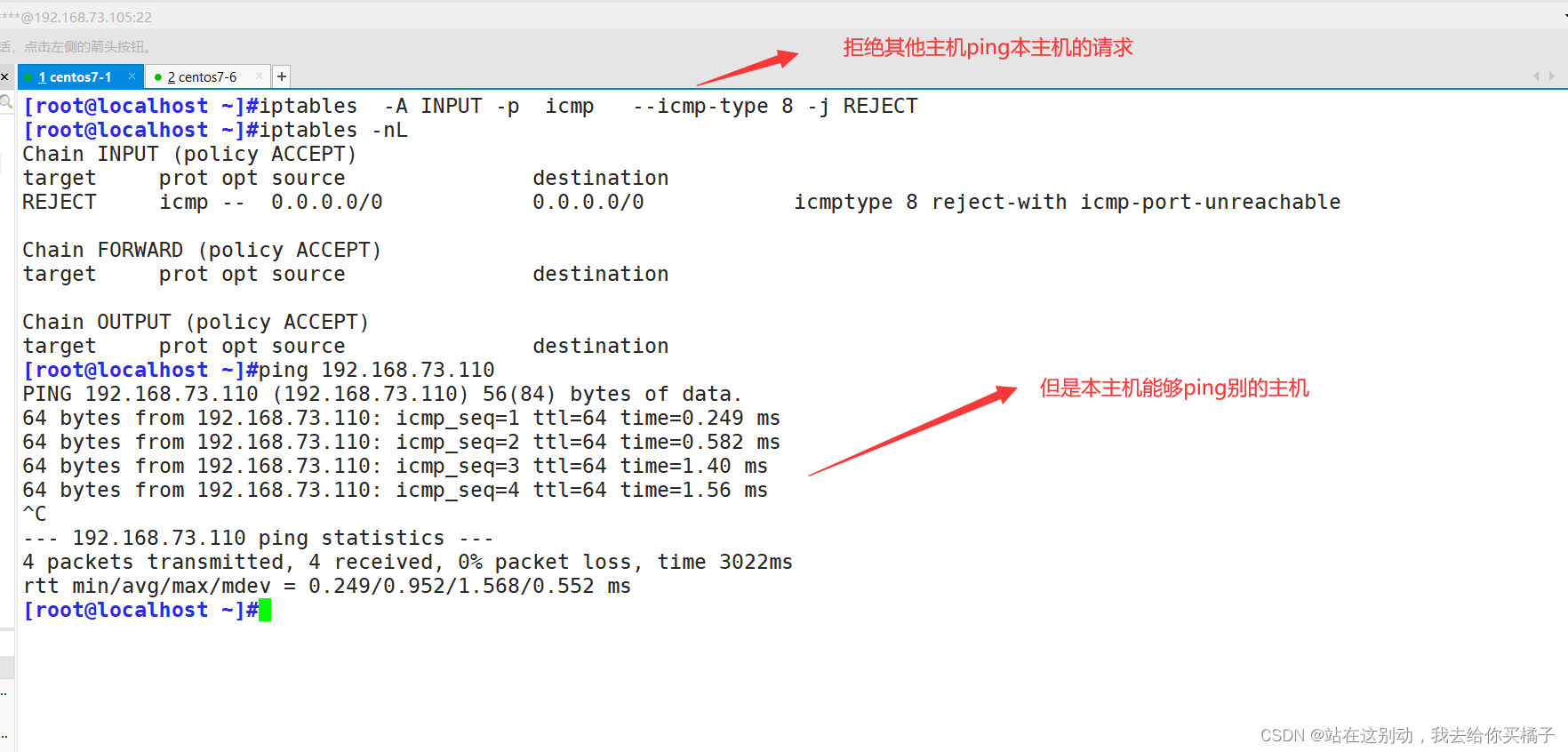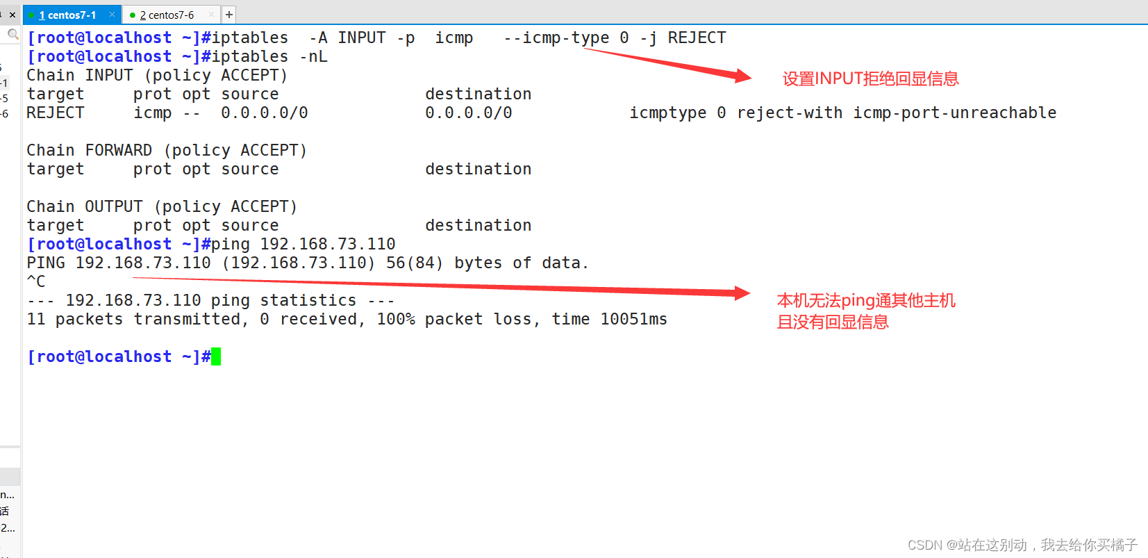 - [root@localhost ~]#iptables -A INPUT -s 192.168.73.110 -j DROP