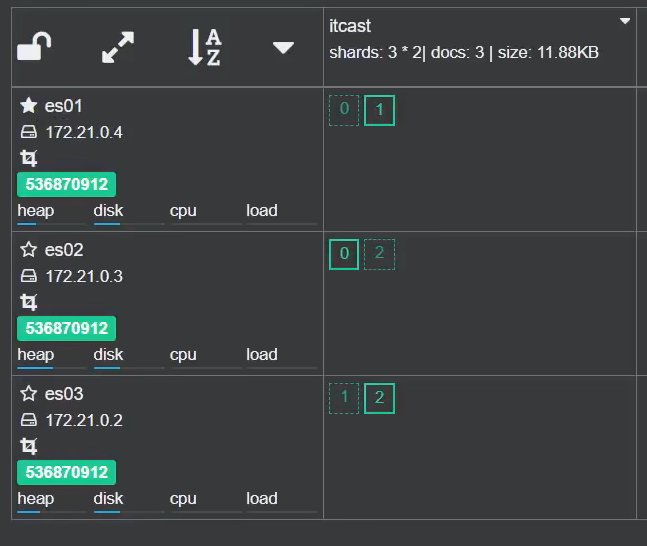 此时es01节点上的1主分片和0副本分片没了,主节点转到es03,控制es01节点的数据迁移到es02和03。