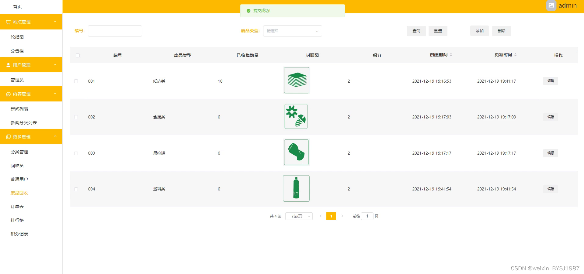 废品回收管理页面,在此页面,可对废品类型、编号、已手机数量、积分、图片等信息进行维护管理,如图5-3所示。