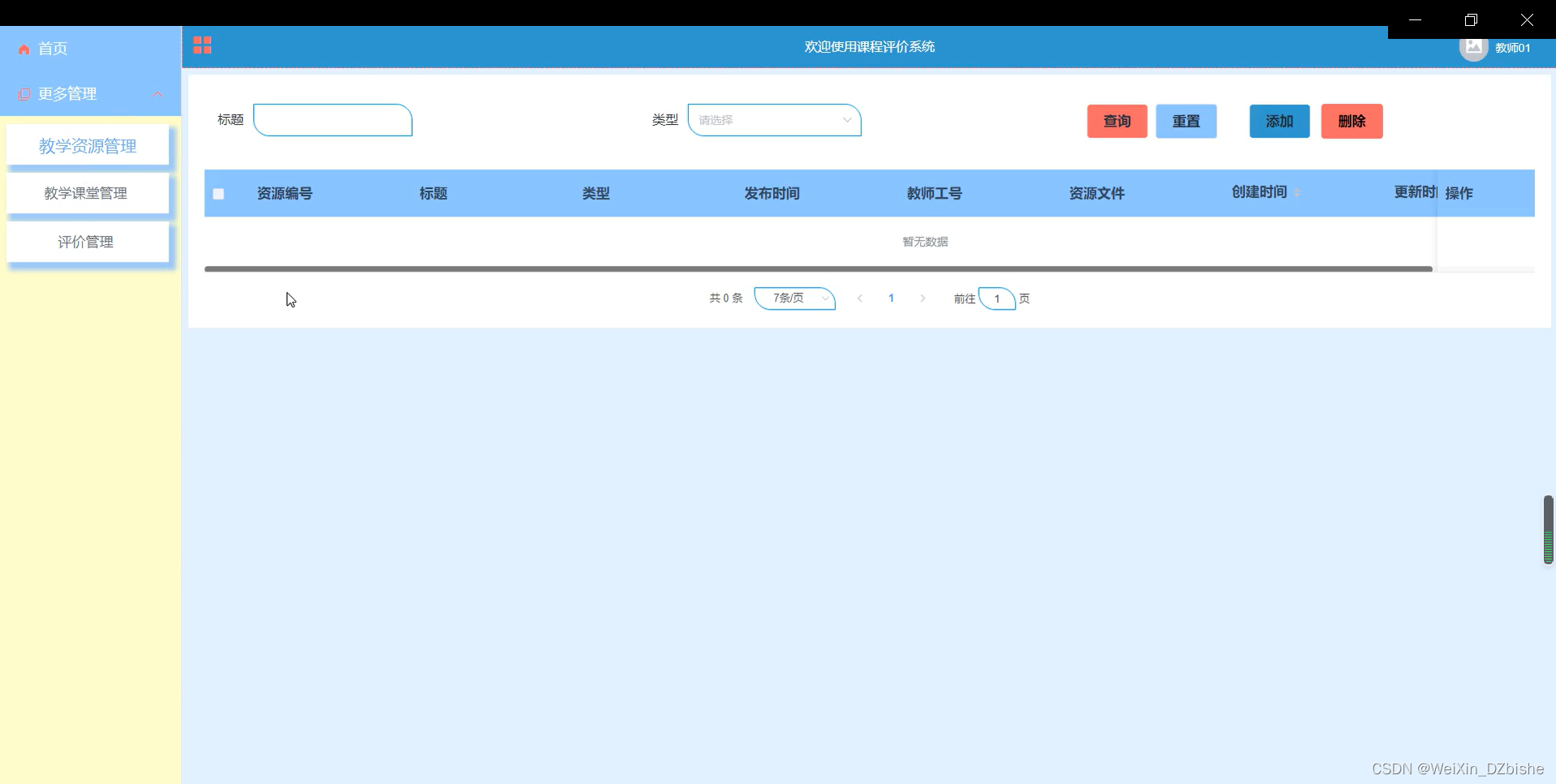 评价管理,评价管理管理页面中可以查看索引、标题、类型、教师工号、理解难度、自我评价等信息进行相对应操作,如图5-13所示。