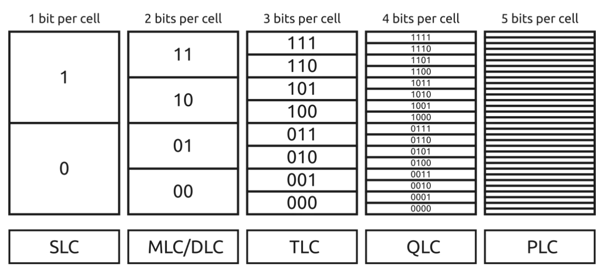 我们在回顾下NAND的四个类型:SLC、MLC、TLC、QLC(这里我们就先不提PLC了,原因参考第一部分介绍)