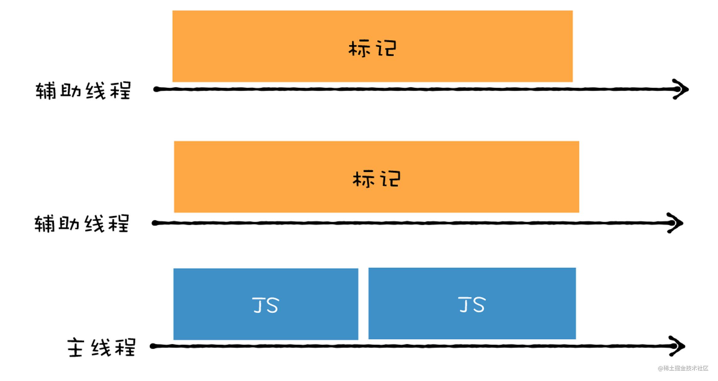 首先主垃圾回收器主要使用并发回收,在主线程执行 JavaScript时,辅助线程就开始执行标记操作了,所以说标记是在辅助线程中完成的。