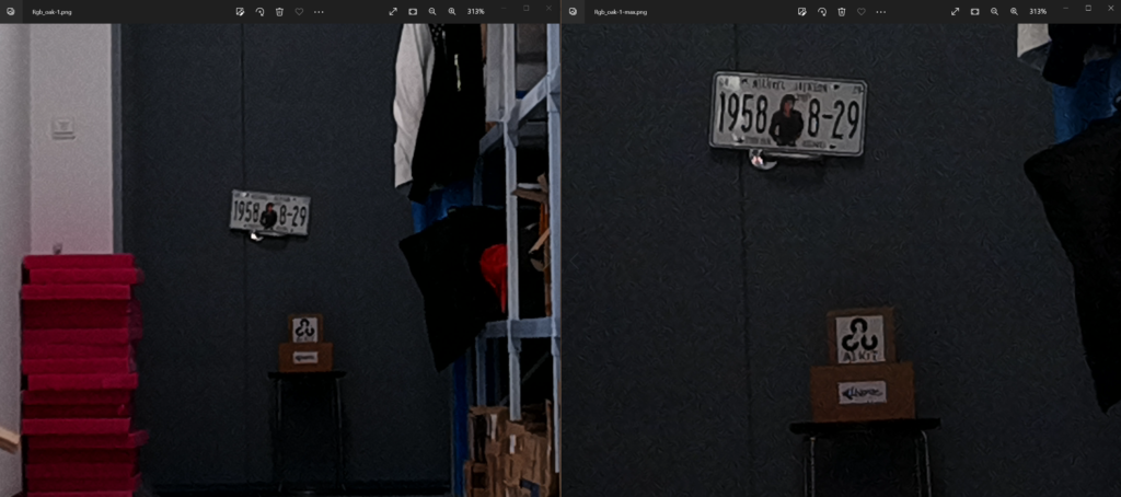 哪怕是将两张图片放大到同一倍数,OAK-1-MAX的画质也依旧更好。