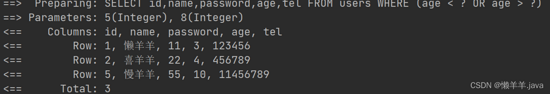 SELECT id,name,password,age,tel FROM user WHERE (age < ?)
