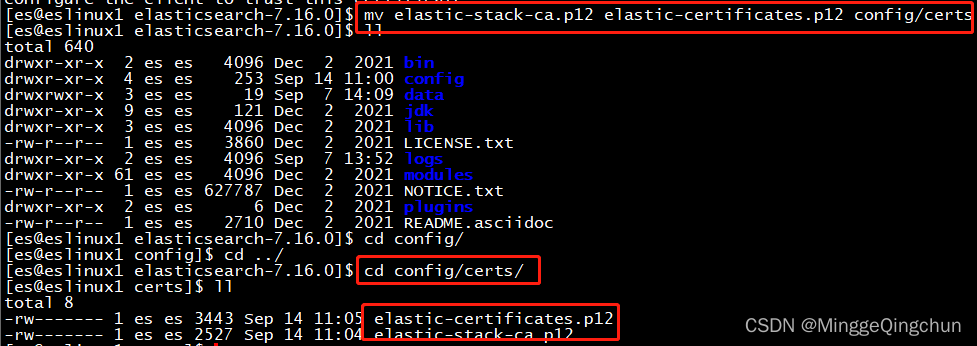 - mv elasticsearch/http.p12 kibana/elasticsearch-ca.pem config/certs