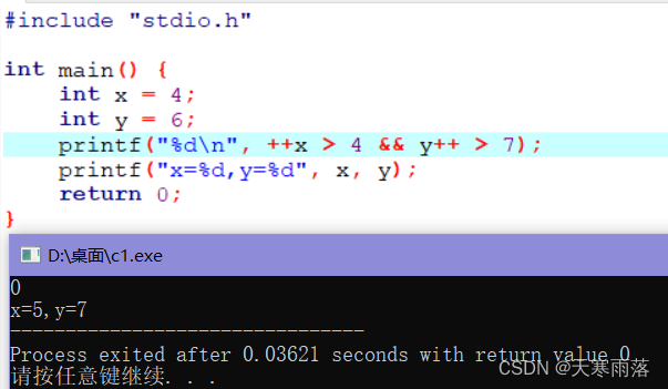 特别提示:运算类似比如++x>4&&y++>7,依旧按照上面所述++x是先加1在和4比较,4+1为5大于4所以为真执行后面的代码,而y++是先和7比较然后加1,6小于7所以输出0,效果如图下所示:
