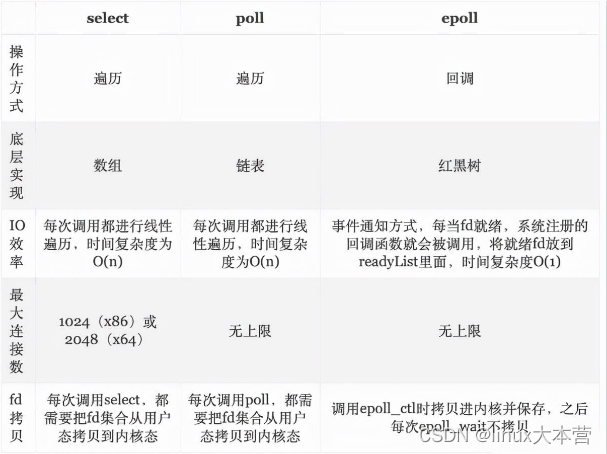 调用epoll_create时,在内核cache里建了个红黑树用于存储以后epoll_ctl传来的socket外,还会再建立一个list链表,用于存储准备就绪的事件。