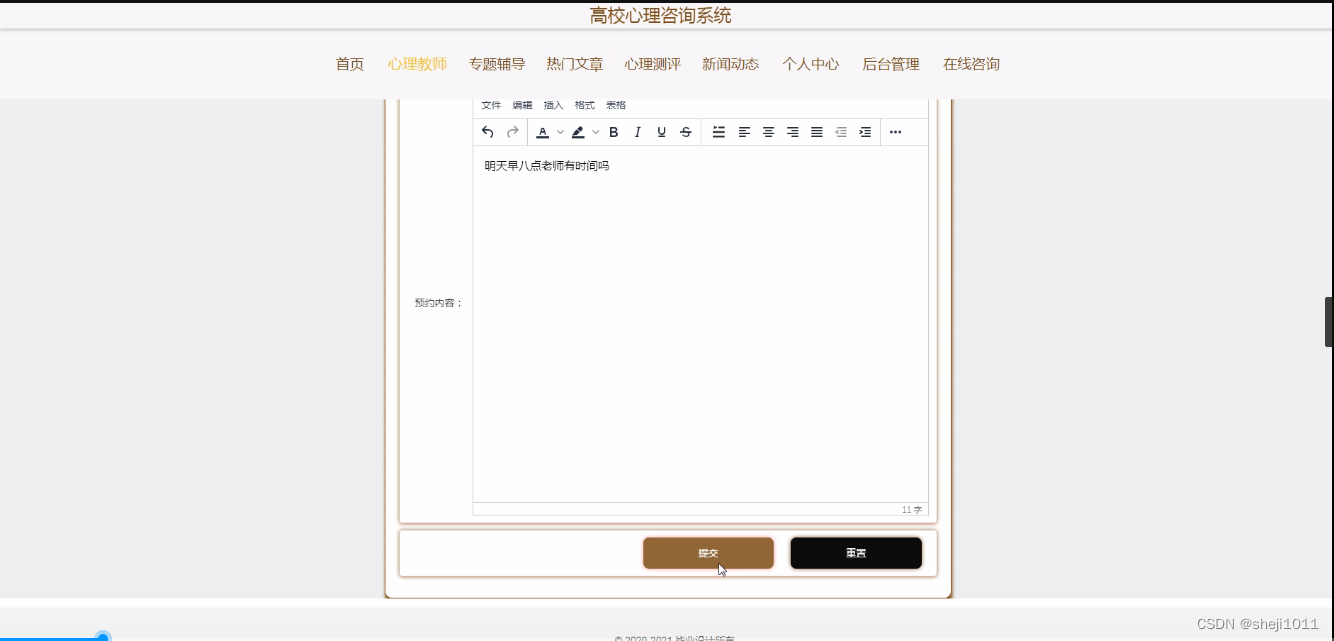 • Springboot毕设项目高校心理咨询系统y34td(java+VUE+Mybatis+Maven+Mysql)