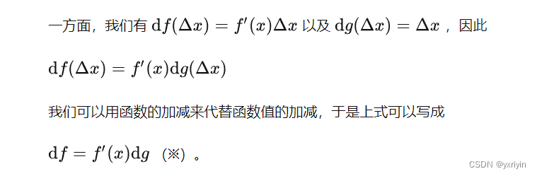也就是说,对于任意一个dy=f'(x)dx,我们可以对y和x进行任意的换元,然后根据链式法则,可以推导出这个式子依然成立。