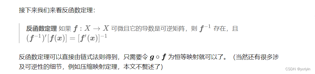 所以他求导就是一个单位矩阵,假定是一阶一元,那么就是1.所以1 = 两个互为逆映射的求导的乘积。所以就是反函数定理。
