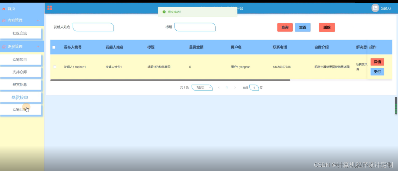 3、功能的完善性:管理员;首页、站点管理(轮播图、公告栏)用户管理(管理员、注册用户、发起人)内容管理(社区交流、交流分类、众筹资讯、资讯分类)更多管理(项目分类、众筹项目、支持众筹、悬赏招募、悬赏接单、众筹回报);