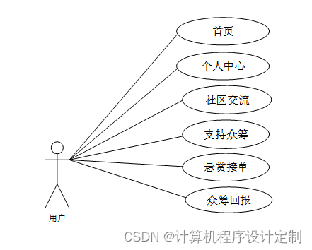 用户后台功能界面,在用户后台功能界面图可查看管理首页、社区交流、支持众筹、悬赏接单、众筹回报等功能,如图5-6所示。