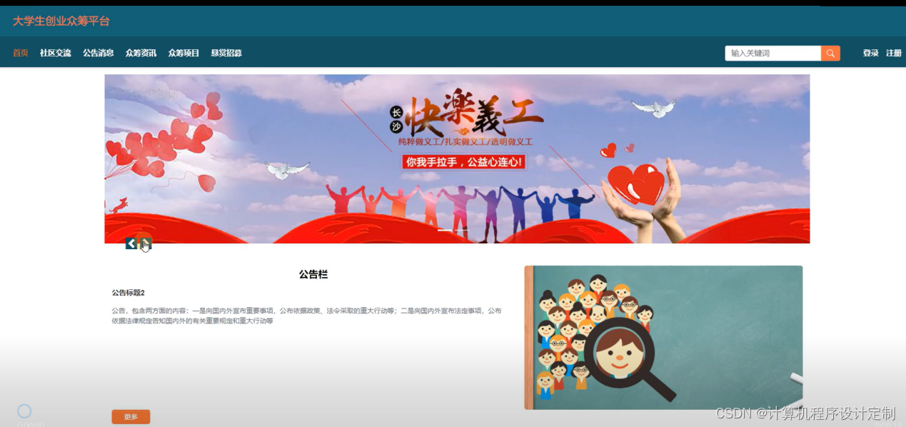系统主页;首页、社区交流、公告消息、众筹资讯、众筹项目、悬赏招募、后台管理;