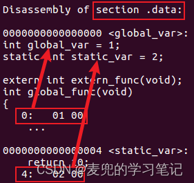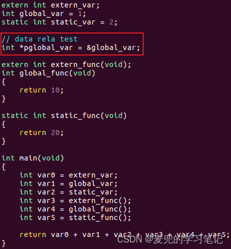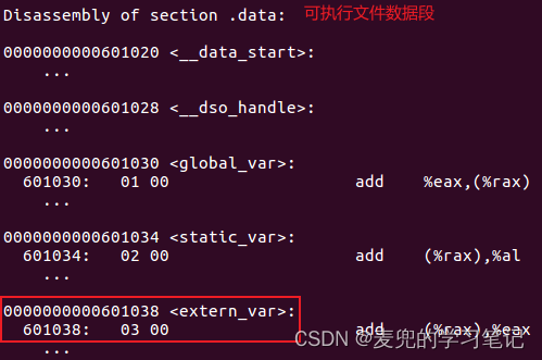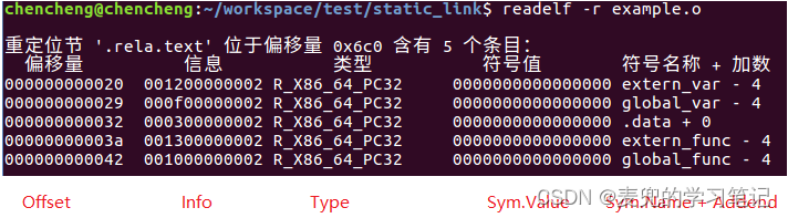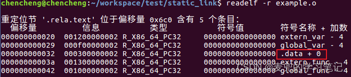 说明2:此处.got段中的表项也需要进行重定位,extern_var和global_var的重定位信息被链接在.rela.dyn段,加载时动态链接时会在偏移量处填入符号的真实地址
