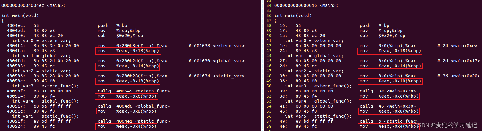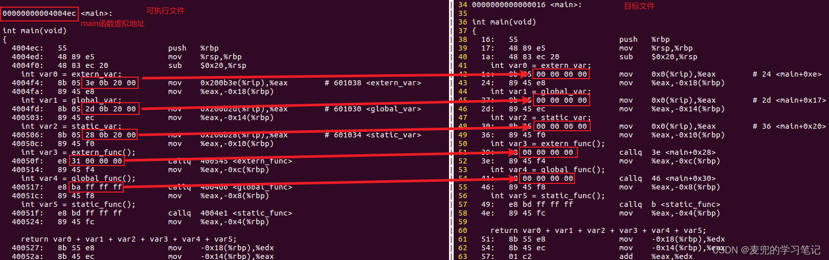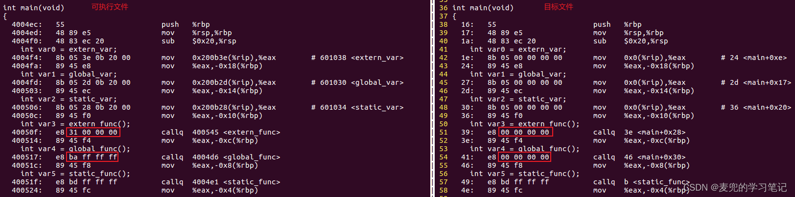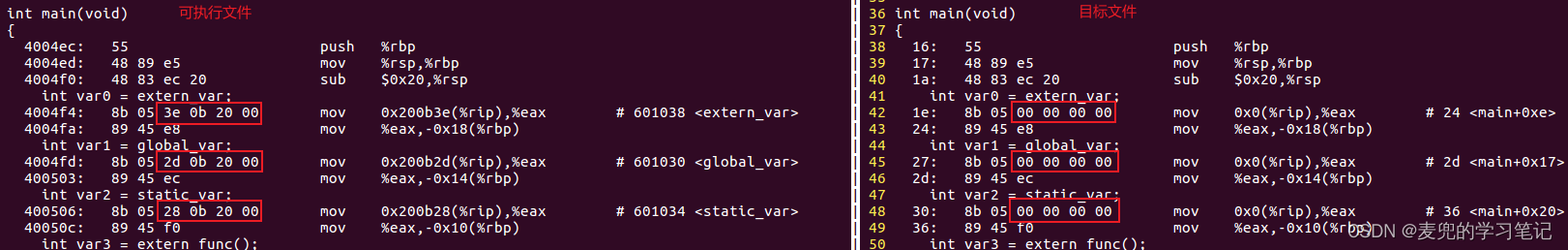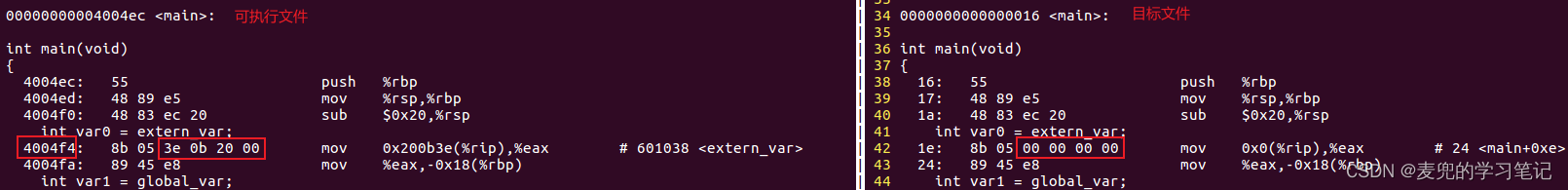 3. 先粗略对比一下目标文件和可执行文件main函数中对符号访问处理的差异,详见后文分析