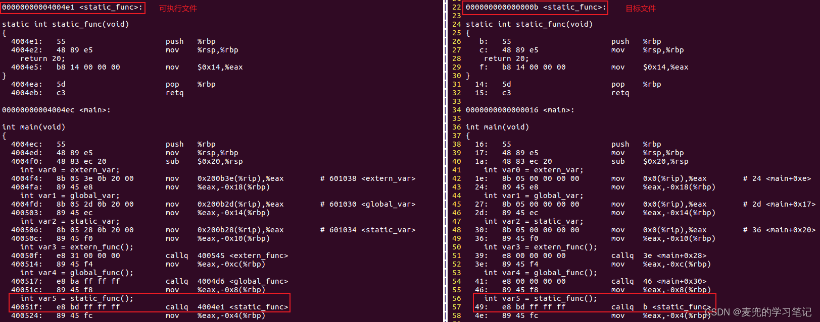 1. 目标文件和可执行文件对静态函数的处理方式相同,生成的二进制机器码均为e8 bd ff ff ff,其中e8是callq指令的编码,后面的4B对应被调函数的地址