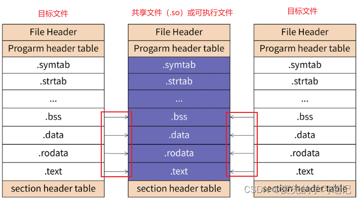 1. 每个中间文件都有自己的代码段、数据段等多个section,在合并时,一般采用相似段合并的策略,最终生成共享文件(.so)或可执行文件