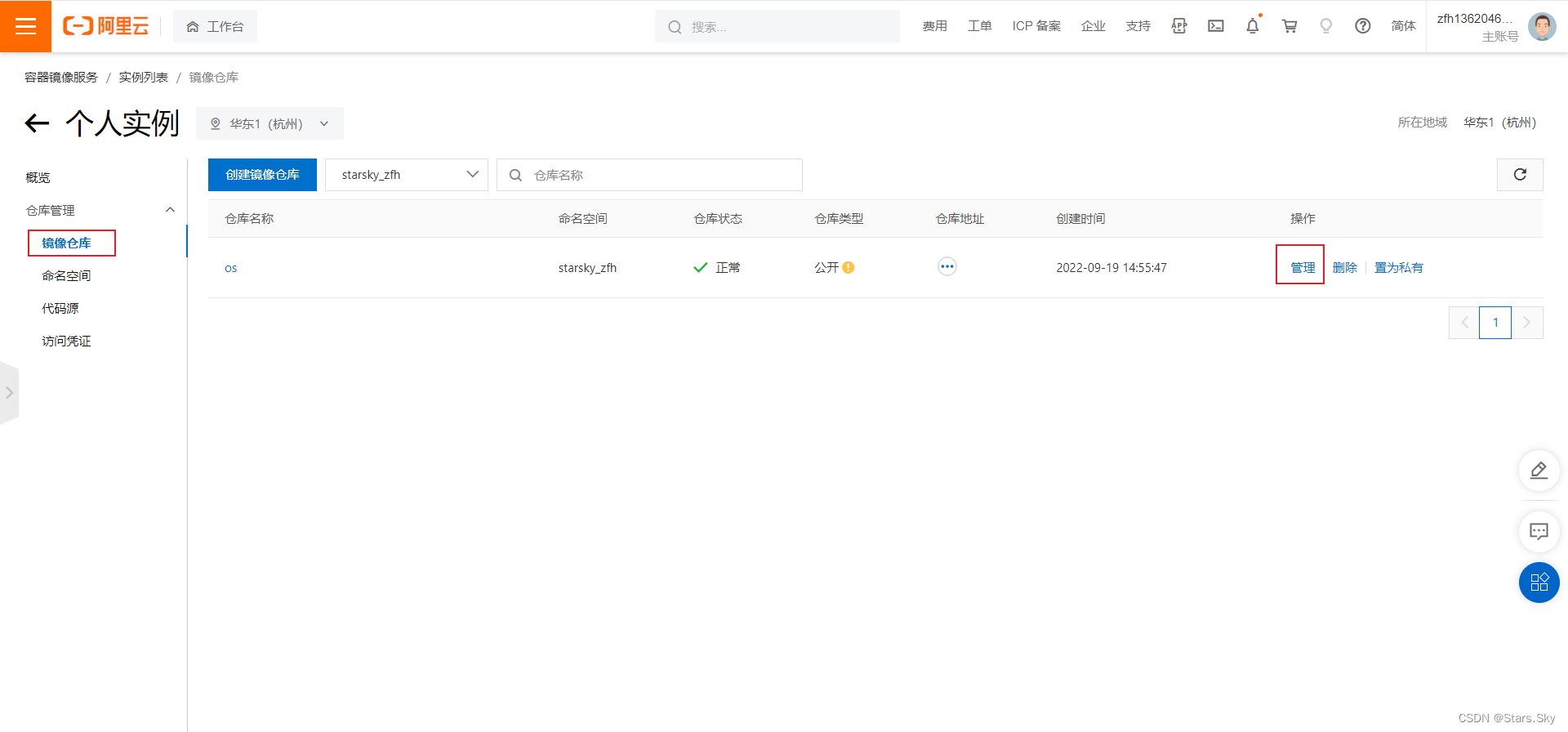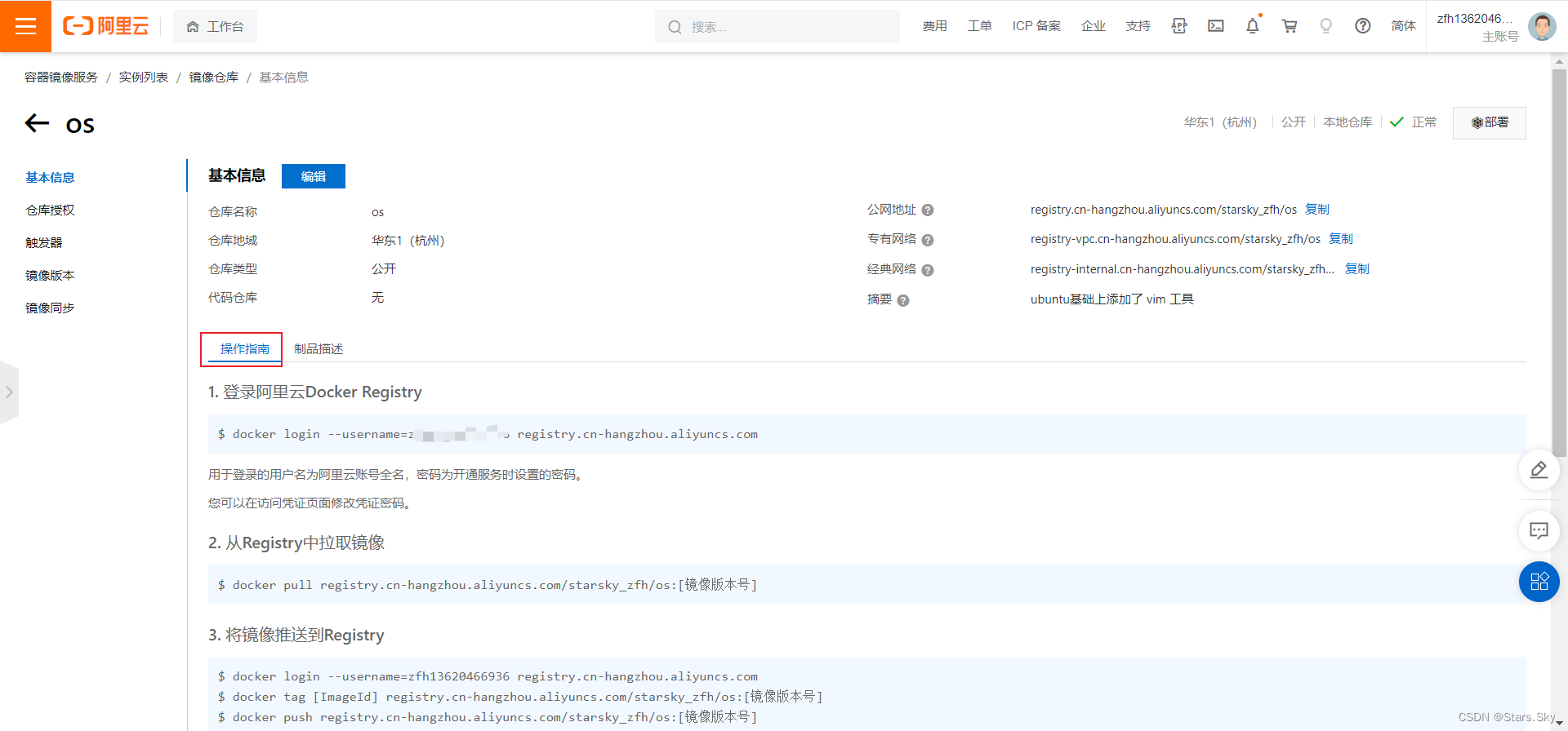 - $ docker push registry.cn-hangzhou.aliyuncs.com/starsky_zfh/os:[镜像版本号]