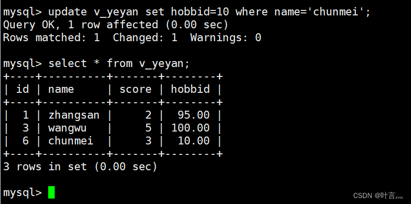 create view v_yeyan(id,name,score,hobbid) as select ye.id,yan.name,ye.hobbid,yan.sd,yan.score from yan,ye where yan.name=ye.name;