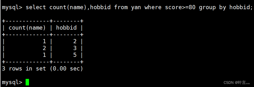 - select count(name),hobbid from yan where score>=80 group by hobbid;
