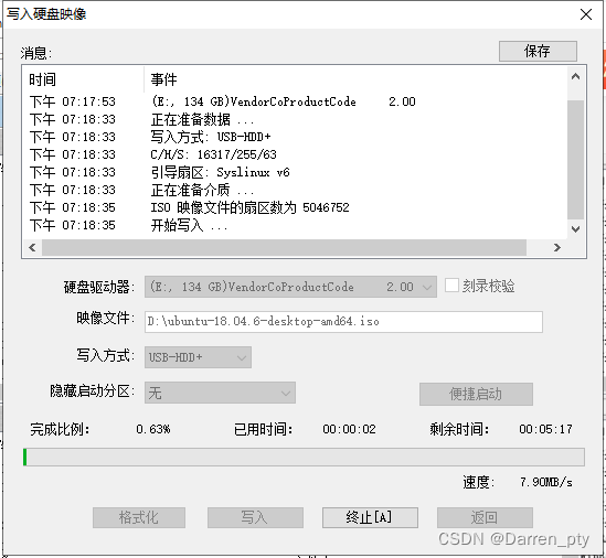 查看硬盘驱动器是否为你的U盘(一般默认会识别到你的U盘),查看映像文件是否为你的ubuntu镜像文件。确认无误后点击格式化,格式化完成后,点击写入,等待写入完成。