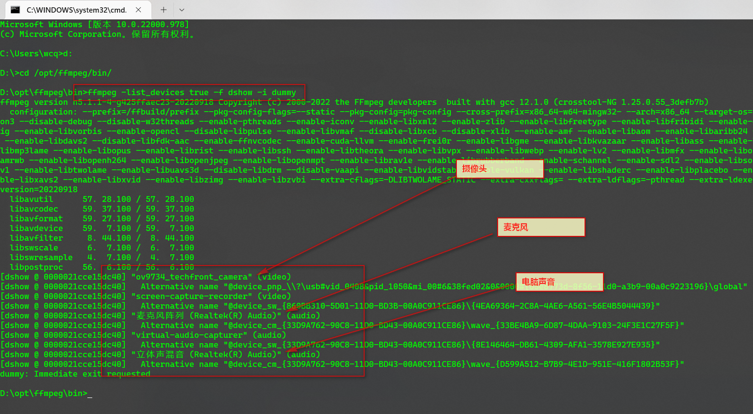 输入:ffmpeg -list_devices true -f dshow -i dummy,查看可用设备的清单(每台电脑的结果都不太一样,但是相似,可以根据我下面的结果甄别自己电脑的设备):