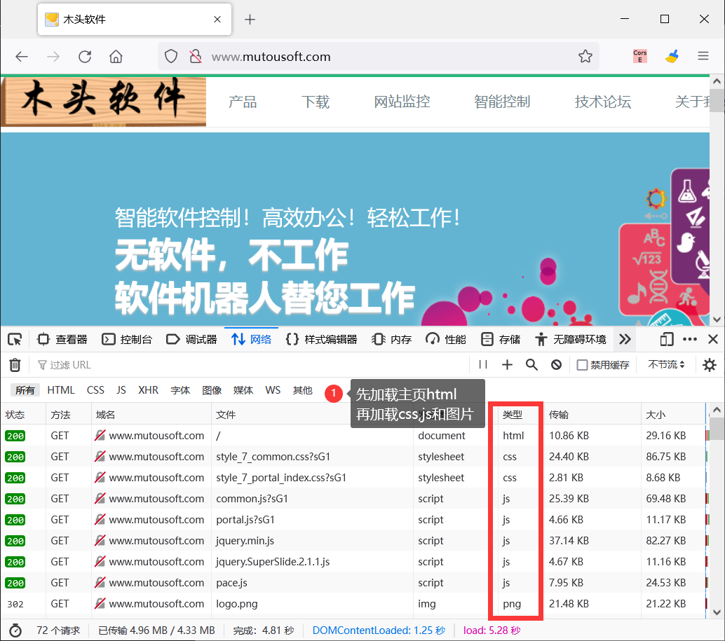一般浏览器先加载主页,再请求关联的js脚本文件。不管你把js代码嵌入在html中,还是独立保存为一个文件,都必须等待主页加载完成,js代码加载完成后才能执行。网上有人说把js代码放在head里面,其实这样并不影响脚本执行时机。因为js或html还没有加载,何谈执行js代码。先看一下页面加载资源的顺序