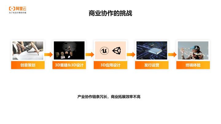 我们再看一下商业协作的挑战:元宇宙这个新兴产业的技术栈十分复杂,本质上源于其使用了过去几十年人类成熟和正在演进的所有IT技术。这也导致新产业的商业协作链路十分冗长。我们在过去一段时间对产业进行了认真梳理,将产业模型逐渐简化到五个环节,目前绝大多数客户和伙伴都在这五个环节中。前面有一个嘉宾提到,做一个数字人、虚拟空间等要多少钱,这中间最大的问题是大家的协作效率极其低,使其成本很高,效果也并不理想。如何让大家效率提升,同时做出更多有用的东西,这才是我们的亟待要解决的商业协作的问题。