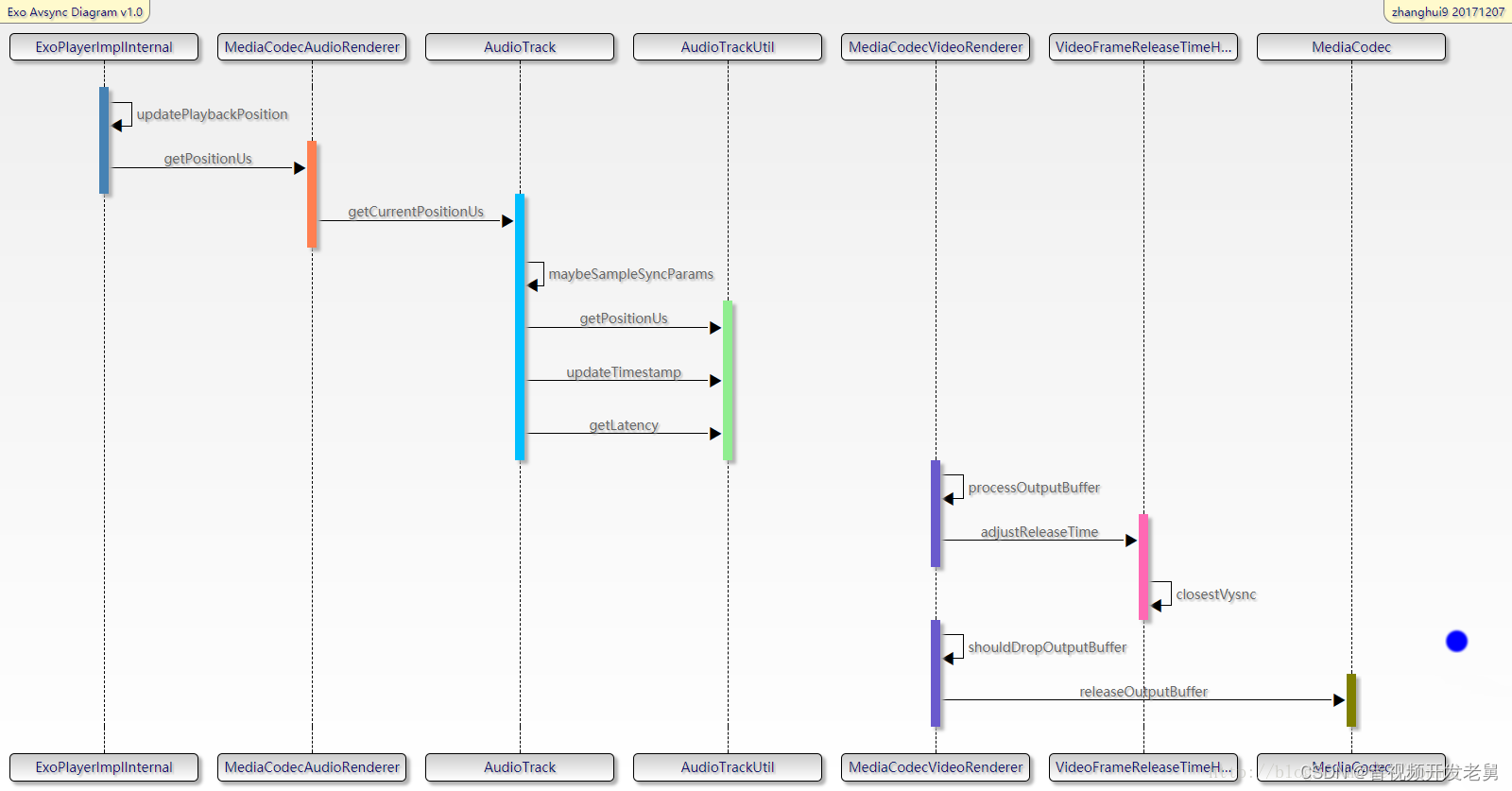 MediaCodecAudioRenderer和MediaCodecVideoRenderer分别是处理音频和视频数据的类,在MediaCodecAudioRenderer中会调用AudioTrack的write方法,写入音频数据,同时还会调用AudioTrack的getTimeStamp、getPlaybackHeadPosition、getLantency方法来获得“Audio当前播放的时间”。在MediaCodecVideoRenderer中会调用MediaCodec的几个关键API,例如通过调用releaseOutputBuffer方法来将视频帧送显。在MediaCodecVideoRenderer类中,会依据avsync逻辑调整视频帧的pts,并且控制着丢帧的逻辑。