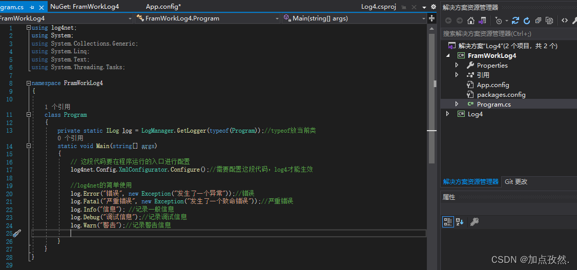 - log4net.Config.XmlConfigurator.Configure();//需要配置这段代码,log4才能生效