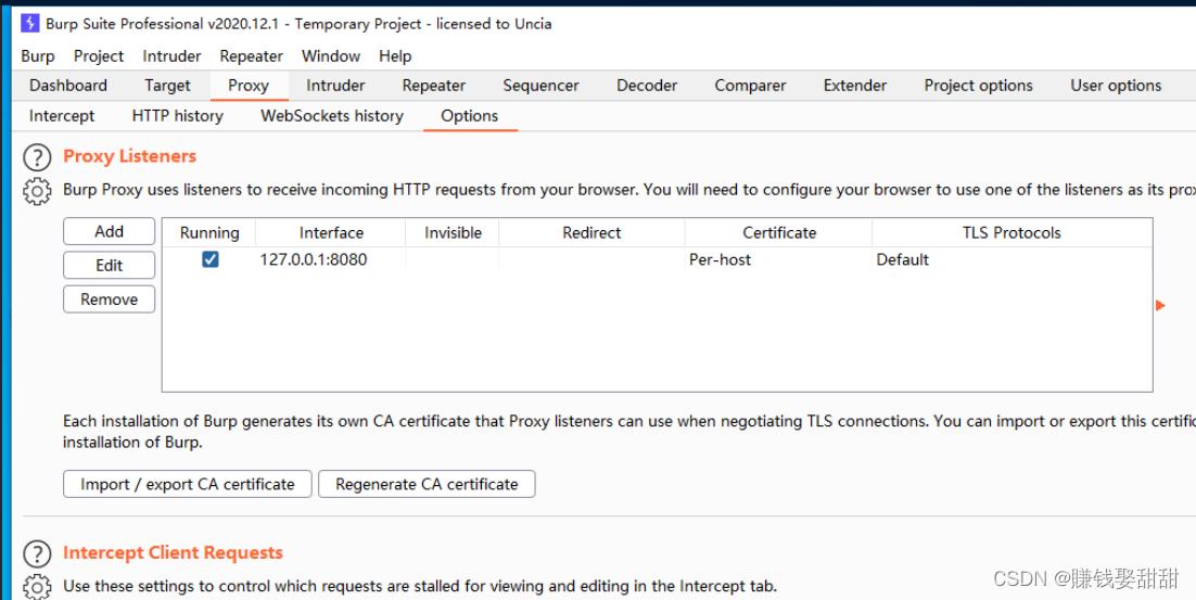 6、切换到“Proxy”代理模块的“Options”,查看Bp的代理