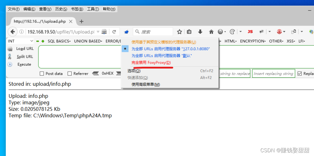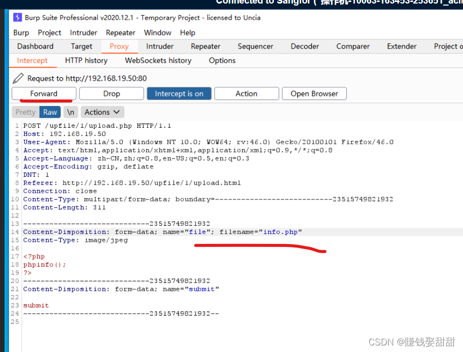 11、点击“Forward”,转发数据包,切换到浏览器,脚本文件成功上传