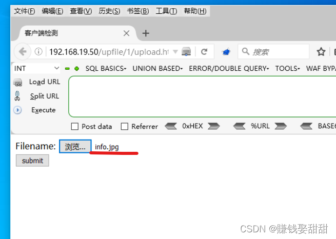 8、客户端只能上传jpg文件,将脚本文件info.php更改后缀名为info.jpg,再选中文件