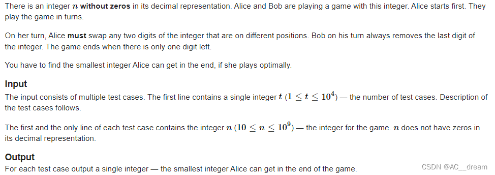 分析:其实模拟不难发现,Alice可以把最后想得到的字符一开始通过交换换至前面,然后就可以最后剩下这个字符,根据贪心我们肯定是剩下原串中最小的那个字符,但是需要注意的一点是Alice是必须要进行操作的,如果一开始是两个字符,那么Alice只能最后剩下第二个字符。