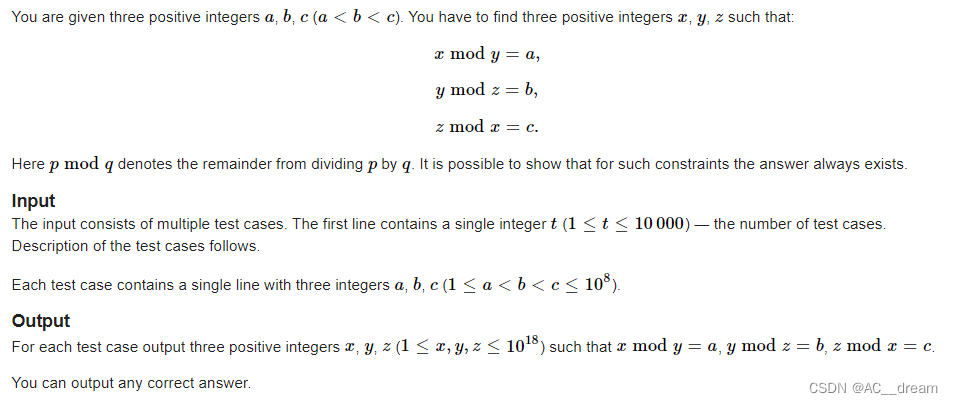 题意:给定一个a,b,c,让我们输出一组x,y,z满足xmody=a, ymodz=b, zmodx=c