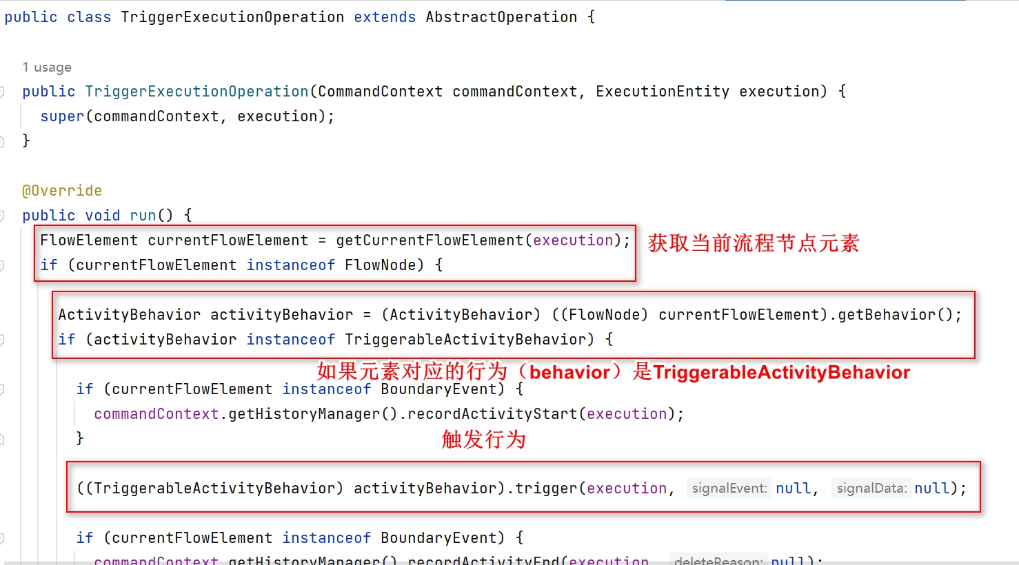 继续回到完成任务,刚才看到往agenda中放了一个 TriggerExecutionOperation,该操作触发等待状态并继续该流程,并离开该活动。