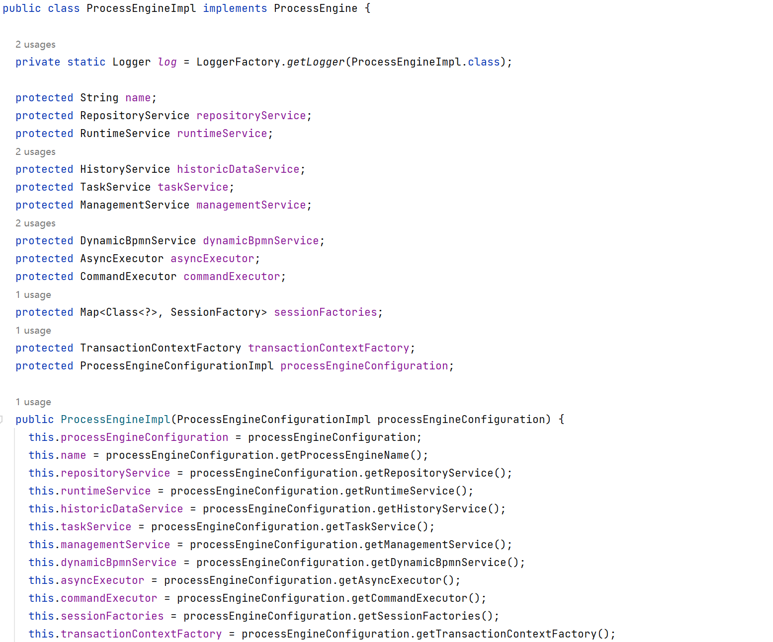 在初始化各个组件以后,new了一个ProcessEngineImpl,并将当前的配置 ProcessEngineConfigurationImpl 赋值给它