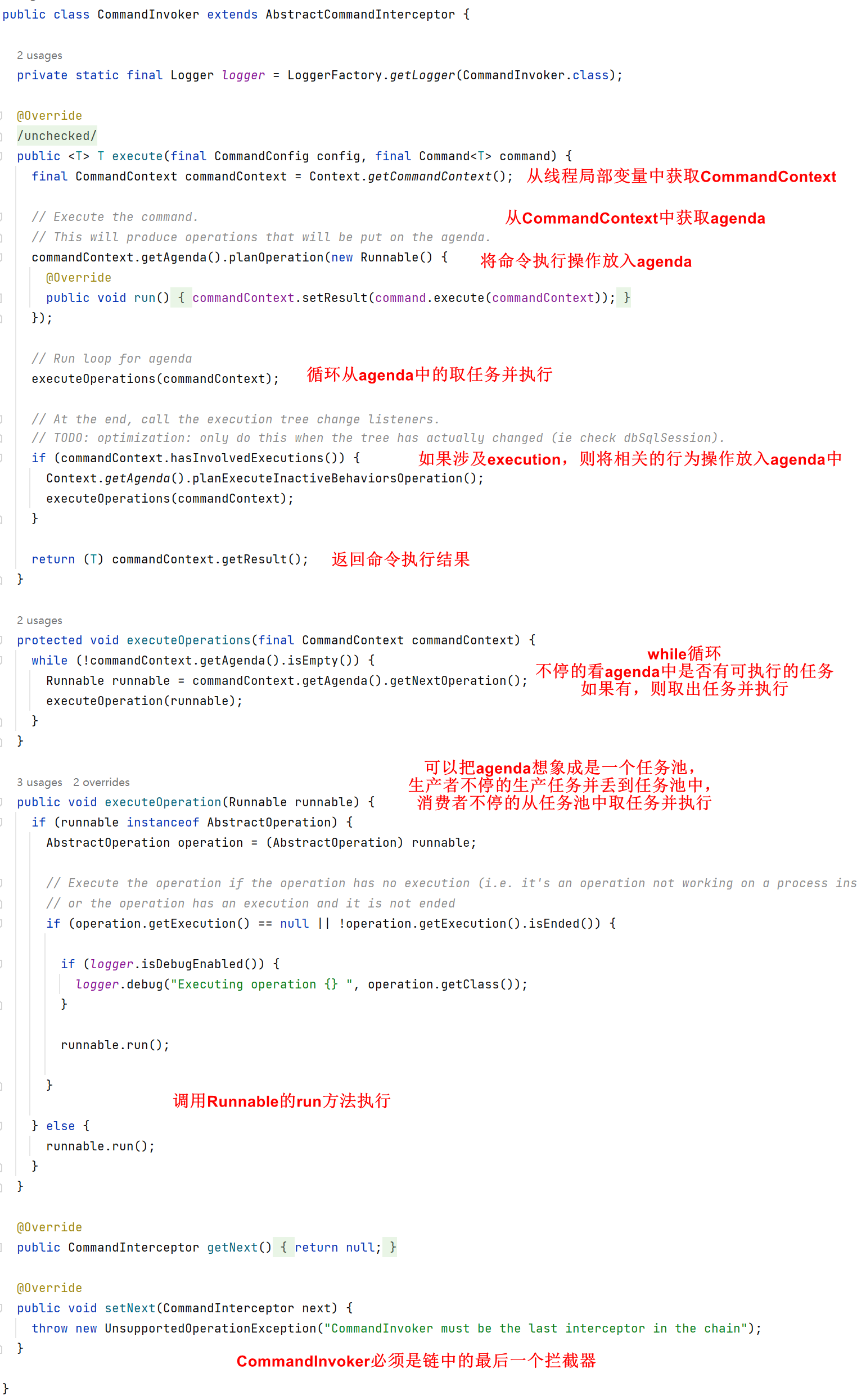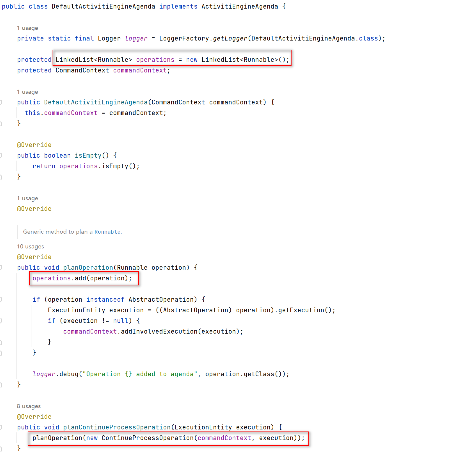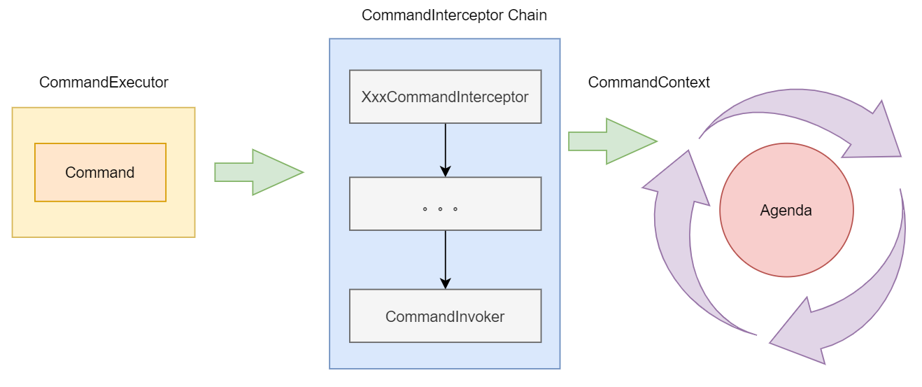 这样的话,CommandContext 相当于会议室,Agenda 相当于这次会议的议程,就是这次会议要商议的事项有哪些,每个 Operation 相当于一个待议事项,在会议进行期间会不断产生很多新的事项,然后一个一个事项的过,直到所有的事项都处理完了。