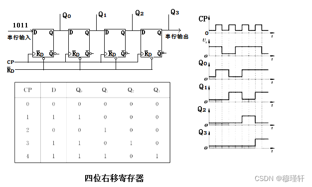 每个触发器的状态在脉冲作用下同时移入下一个触发器,经过四个CP脉冲后,将输出。