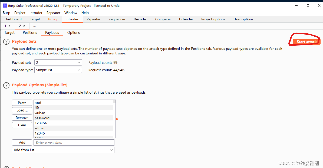 9、设置攻击位置2的payload类型为"Simple list",并加载密码字典