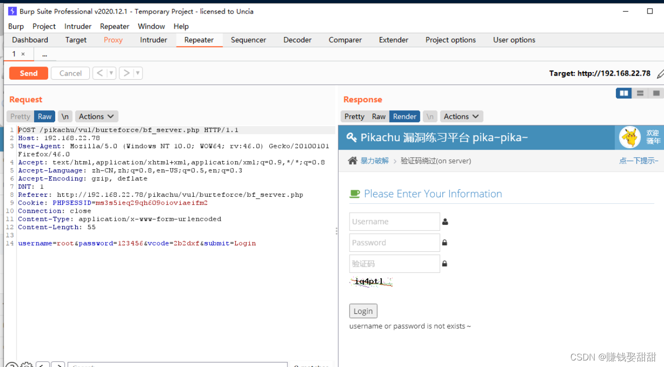 10、换个密码再发送一次数据包,查看响应包,依然提示“username or password is not exists”,正常来说应该提示验证码错误,说明验证码长期有效,可以直接暴力破解