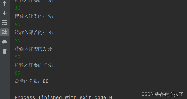 (一)分析: 1.定义一个数组,用来存储六名评委的打分(0~100) 2.定义一个方法求出数组中最大值。 3.定义一个方法求出数组中最小值。 4.定义一个方法求出总分。 4.(总和-最大-最小)/4. (二)代码实现: package edu.test; import java.util.Scanner; public class Test4 { public static void main(String[] args) { int scores[] = getScore();//接收数组 int max = getMax(scores);//接收最高分 int min = getMin(scores);//接收最低分 int sum = getSum(scores);//接收总分 int avg = (sum - max - min) / (scores.length - 2);//算出最后得分 System.out.println("选手的分数:" + avg); } public static int getSum(int scores[]) {//定义一个方法求出总分。 int sum = 0; for (int o = 0; o < scores.length; o++) { sum = sum + scores[o]; } return sum; } public static int[] getScore() { int scores[] = new int[6];//定义一个数组,用来存储六名评委的打分(0~100) Scanner sc = new Scanner(System.in); for (int i= 0; i < scores.length; ) { System.out.println("请输入评委的打分:"); int score = sc.nextInt(); if (score >= 0 && score <= 100) { scores[i] = score; i++; } else { System.out.println("输入分数范围错误,当前一共有" + i + "个分数"); } } return scores;//将数组返回。 } public static int getMax(int scores[]) {//定义一个方法求出数组中最大值。 int max = scores[0];/*经典算最大值的方法,值得注意的是区分清楚,马虎写成(scores[i]>scores[max])会索引越界报错*/ for (int i= 1; i < scores.length; i++) { if (scores[i] > max) { max = scores[i]; } } return max; } public static int getMin(int scores[]) {//定义一个方法求出数组中最小值。 int min = scores[0]; for (int i = 1; i < scores.length; i++) { if (scores[i] < min) { min = scores[i]; } } return min; } }