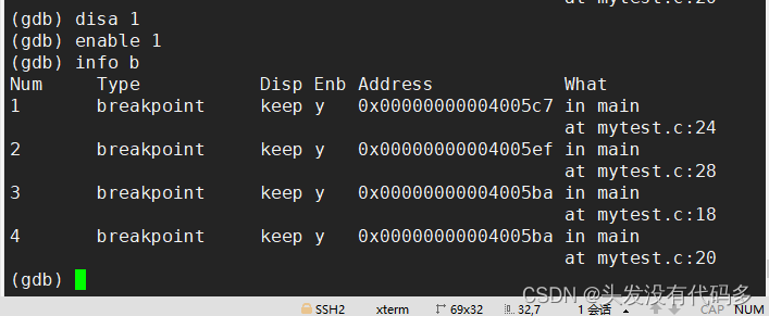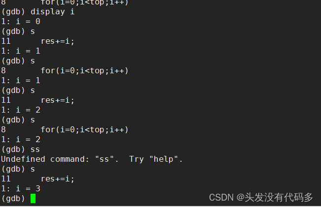 若想继续显示后面的代码,我们不断按回车即可,因为gdb具有记忆功能,当未输入指令时,按回车它会执行最近一次的指令