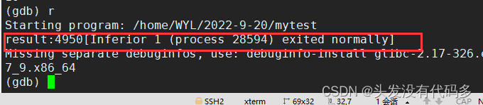 当进入函数后又想退出,输入finish即可,之后我们发现函数已经跑完了,我们可以看到结果4950,此时我们输入bt,发现已经没有刚才函数的栈帧了