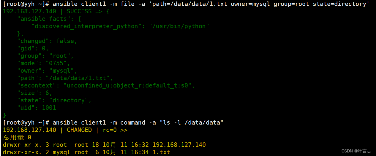 - ansible client1 -m file -a 'path=/data/data/1.txt owner=mysql group=root state=directory'
